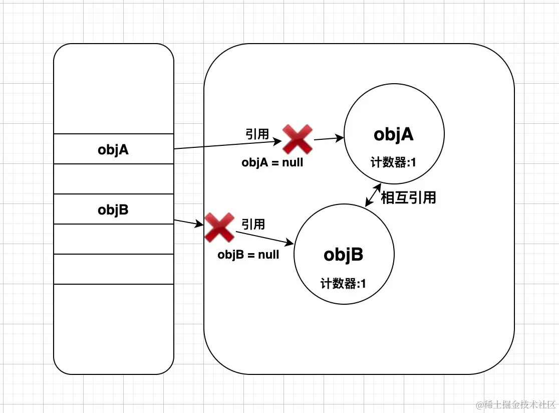 com.rumenz.Testy对象。虽然objA和objB存在相互引用,但是由于栈和堆对象没有了引用关系, 垃圾回收时将objA和objB回收掉,说明JVM虚拟机未使用引用计数法来判断对象是否存活。