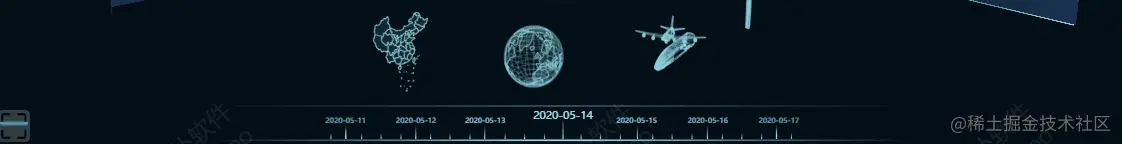 我们采用了 HT for Web 轻量化模型以及 web 组态,在平台界面创建了2D和3D两大面板。其中标题和数据统计按钮部分以及时间轴为 2D 面板。科幻地球和两侧的实时播报部分为 3D 场景。