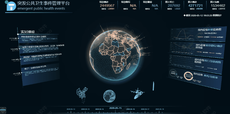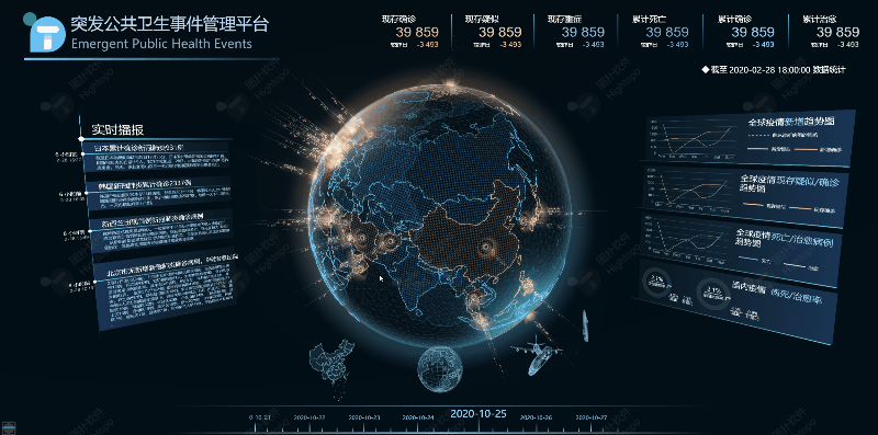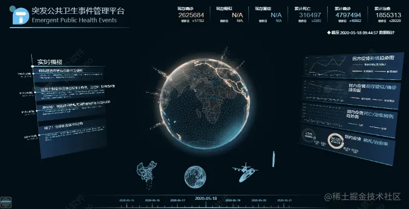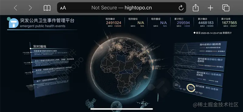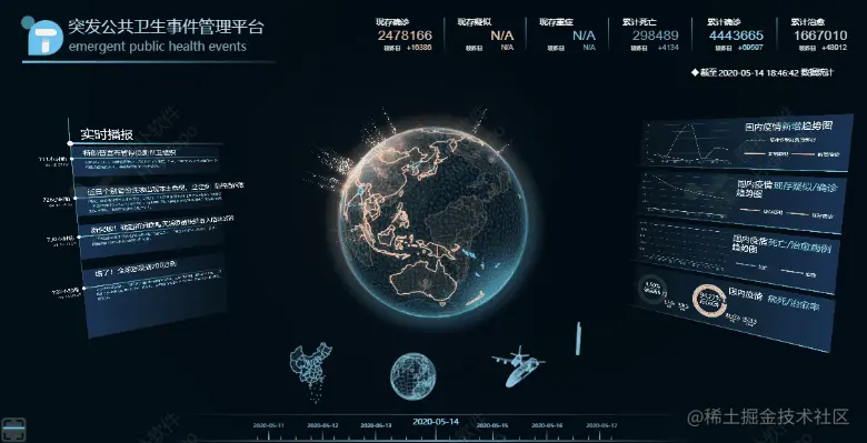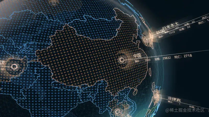 面对此次疫情,在不久之前,我们基于在智慧医院、医院信息化方面的经验,推出过一版国内疫情实时地图(www.cnblogs.com/htdaydayup/… HTML WebGL 的三维可视世界疫情地图。该地图通过 2D 与 3D 的结合,动态展示当前最新的全球疫情数据。