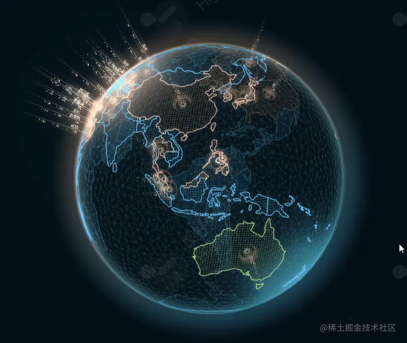 关于更新科幻地球上的数据,我们进行了一个特别的处理。我们不仅会根据各个国家的确诊人数来更新其地图颜色,还会对有光柱的国家进行统计数据的更新。光柱效果如下图。