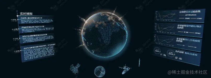 该平台与众不同之处还在于,科幻地球与其他三维组件分属两个 3D 场景,也就是说,科幻地球与实时播报面板两者之间在操作上是不会相互影响的。