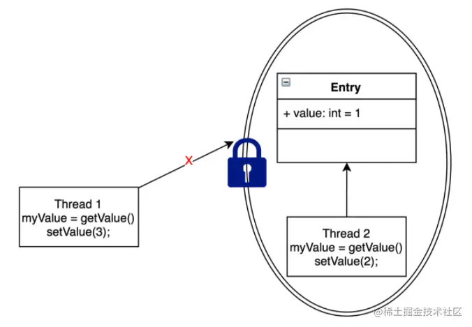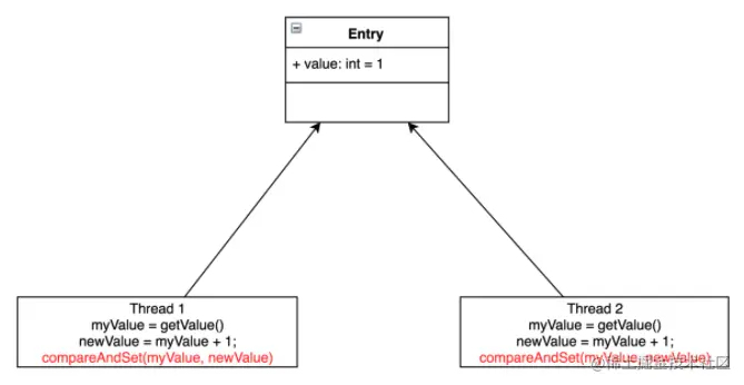 如图所示,Thread1和Thread2都要把Entry加1。若不加锁,也不使用CAS,有可能Thread1取到了myValue=1,Thread2也取到了myValue=1,然后相加,Entry中的value值为2。这与预期不相符,我们预期的是Entry的值经过两次相加后等于3。