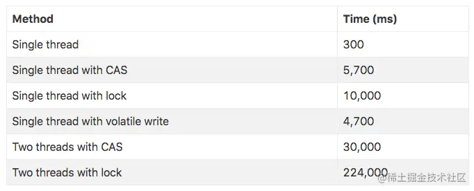 在多线程情况下,为了保证线程安全,必须使用CAS或锁,这种情况下,CAS的性能超过锁的性能,前者大约是后者的8倍。