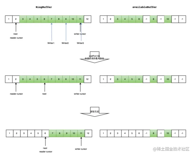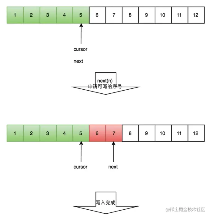 通过do/while循环的条件cursor.compareAndSet(current, next),来判断每次申请的空间是否已经被其他生产者占据。假如已经被占据,该函数会返回失败,While循环重新执行,申请写入空间。