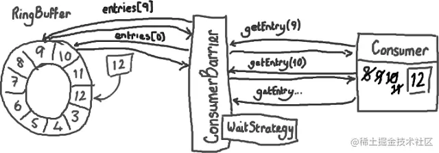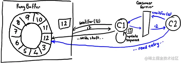 接下来,消费者会一直原地停留,等待更多数据被写入Ring Buffer。并且,一旦数据写入后消费者会收到通知——节点9,10,11和12 已写入。现在序号12到了,消费者可以让ConsumerBarrier去拿这些序号节点里的数据了。