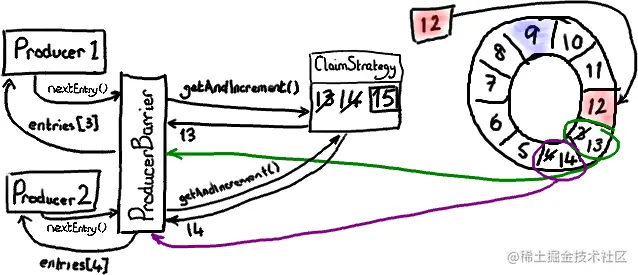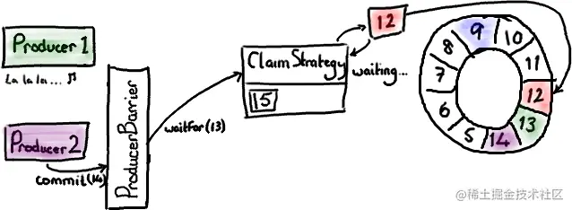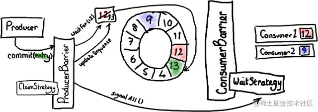 在后台,由 ProducerBarrier 负责所有的交互细节来从 Ring Buffer 中找到下一个节点,然后才允许生产者向它写入数据。