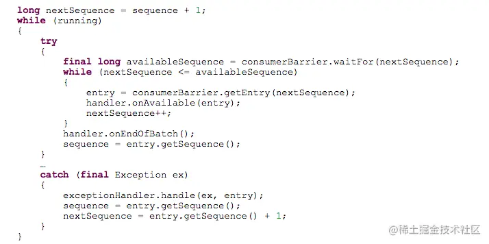 | `1` | `final` `long` `availableSeq = consumerBarrier.waitFor(nextSequence);` |