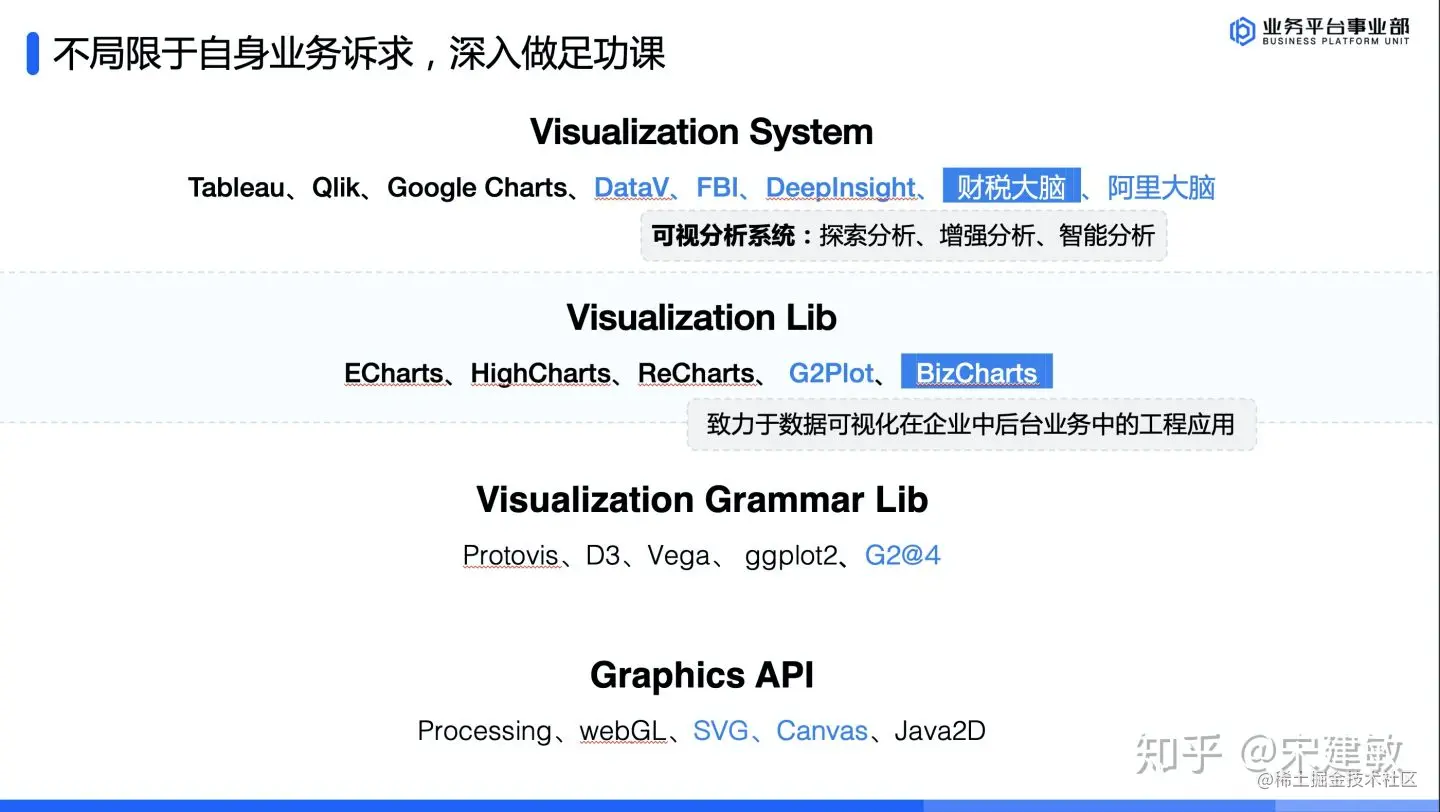 经过主管一番的指点迷津,了解到技术 TL 参与研发的目标后,我开始思考怎么选择项目来确保 ROI,做好时间管理,而不是事事参与后精疲力竭还拿不到结果。此刻再回到业务本身的痛点,贴着业务打是最稳妥的方式,大数据客户运营平台最大的痛点就是可视分析的高效表达,且鉴于之前在 ARMS 监控平台中积累的图表开发经验,我发现自己对数据分析场景下的数据可视化有浓厚的兴趣,可以先从这里入手深入了解一下体系。短短几个月的探索,奠定了我后来几年为之奋斗的细分技术领域方向-数据可视化。