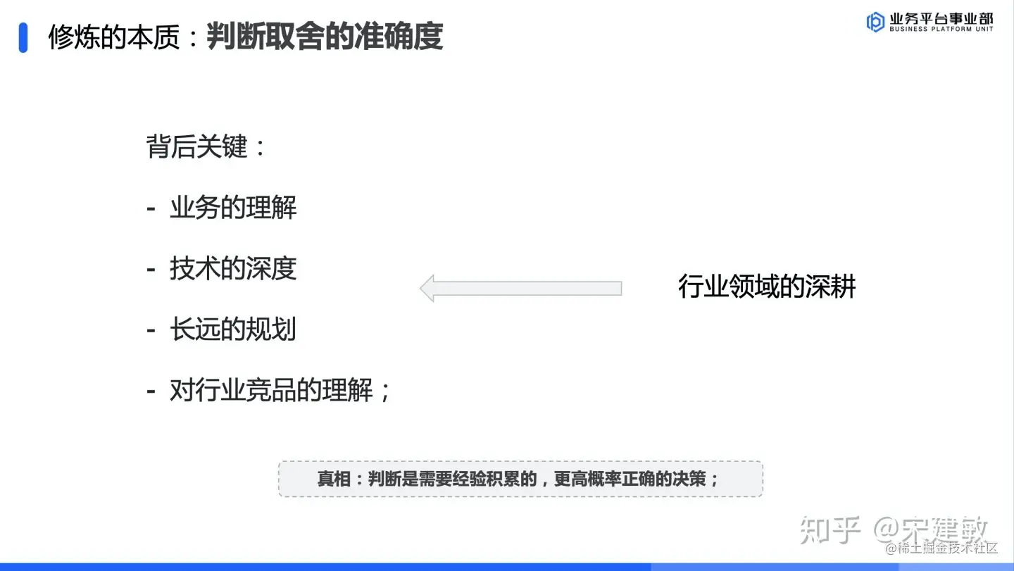 - 专业层面:这个层面已经不单纯讲专业,更多是深度结合细分行业的业务做技术决策和业务决策,产生业务价值;