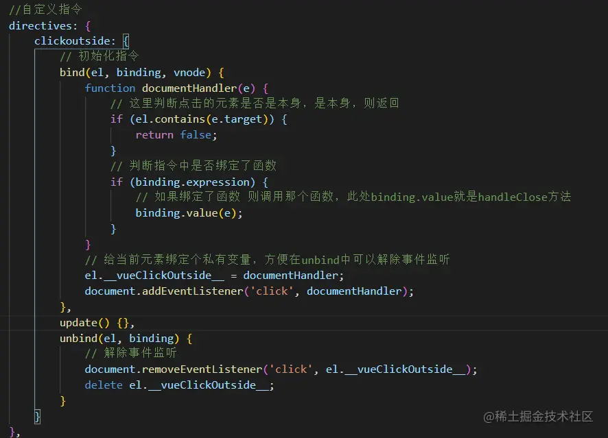 2、当发生click事件的时候判断是否点击的当前对象结合着本思路和指令咱们来实现。