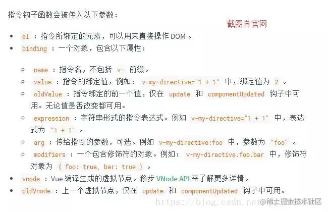 接下来我们来看一下钩子函数的参数 (即 el、binding、vnode 和 oldVnode)。