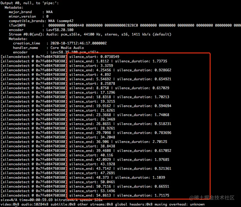 在红框圈中的部分,就是每一个沉默标记段落的开始和结束的时间节点。这样我们就可以继续使用下面的命令来拆分音频: