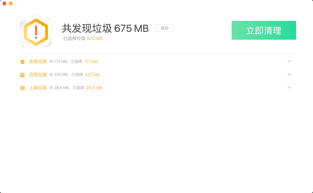使用腾讯柠檬清理软件的“立即清理”功能,扫描出来的结果如下图4所示。共扫描出675MB大小的垃圾文件,其中 系统垃圾171MB、应用垃圾421MB、上网垃圾28.8MB。
