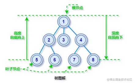 深度是从根节点开始「自顶向下」逐层累加的路径长度,根的深度为1(有些书上也说是 0,问题不大)