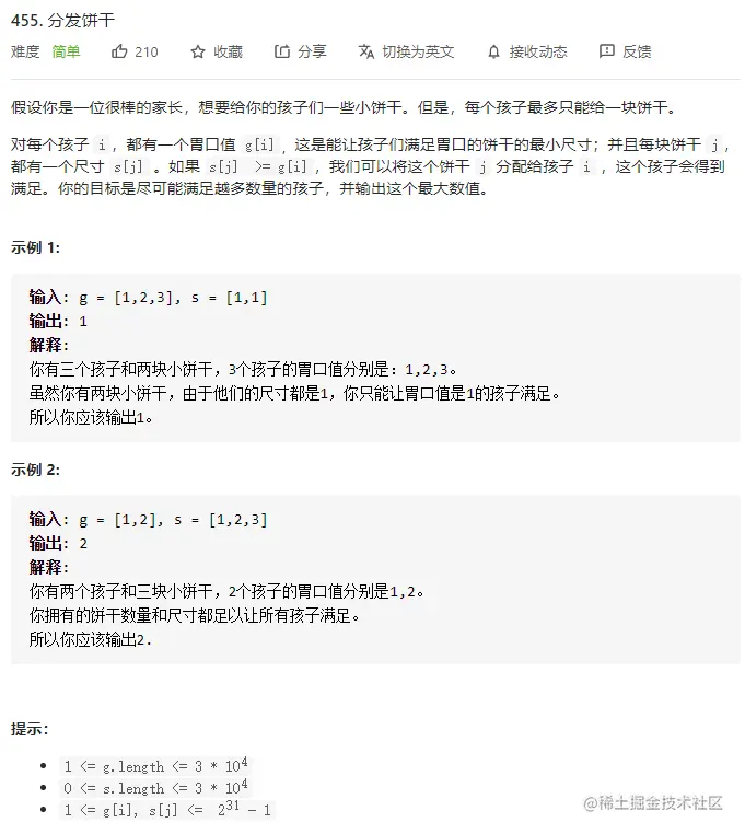 因此,对孩子和饼干尺寸分别从小到大进行排序,然后从小到大遍历每一个孩子,尝试给他分配最小的饼干,如果不满足就找下一块最小的饼干。