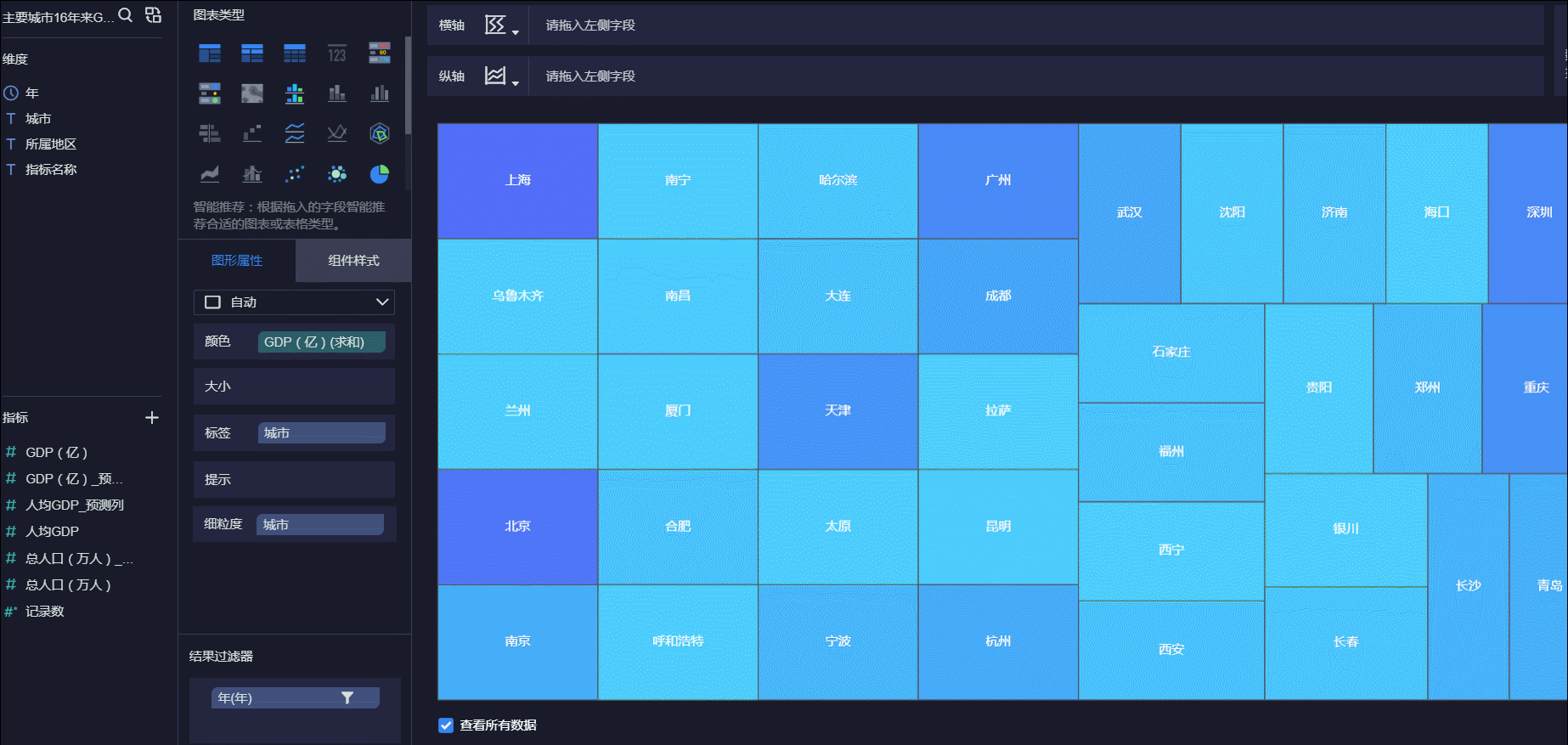 制作可视化非常简单,拖拽数据字段到维度框,立马呈现可视化,然后再基于可视化组件构建仪表板,全程零代码操作