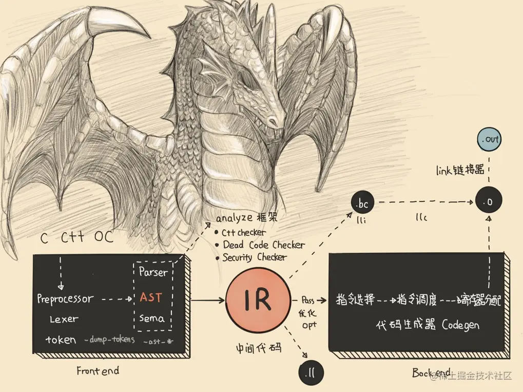 - 预处理:编译开始时,LLVM 会预处理你的代码,比如宏替换、头文件导入;
