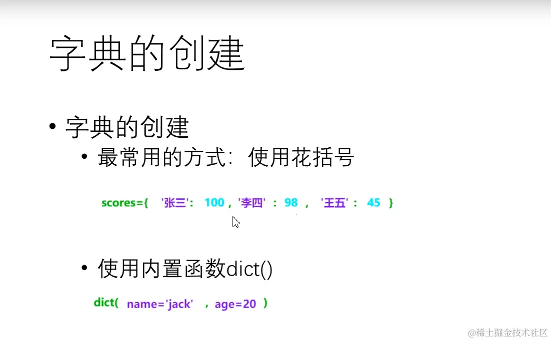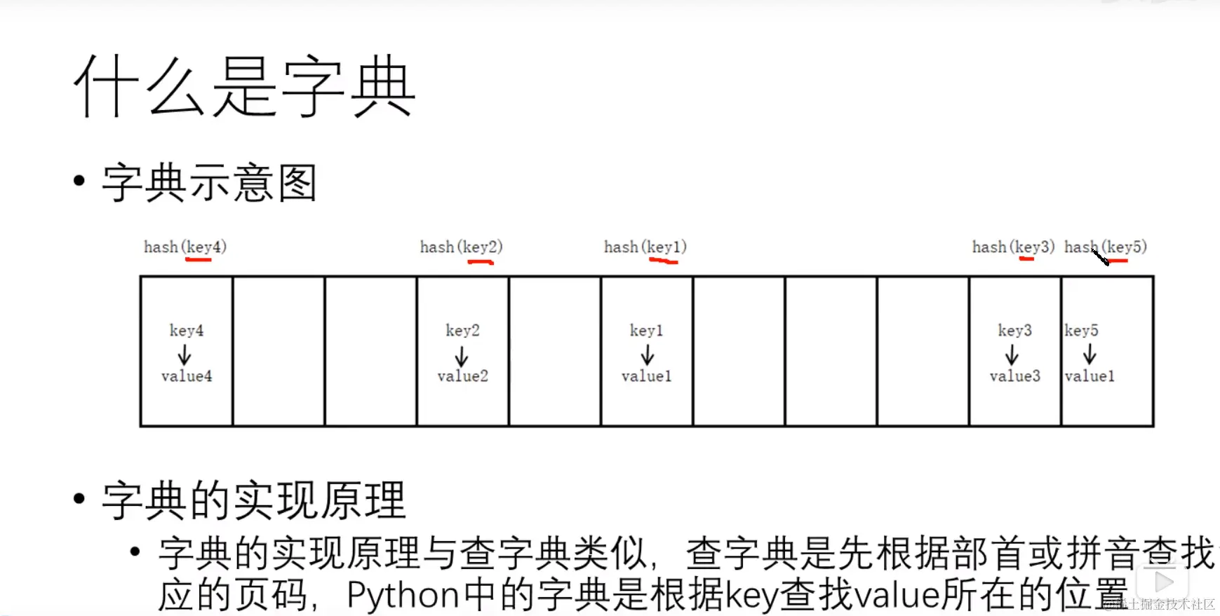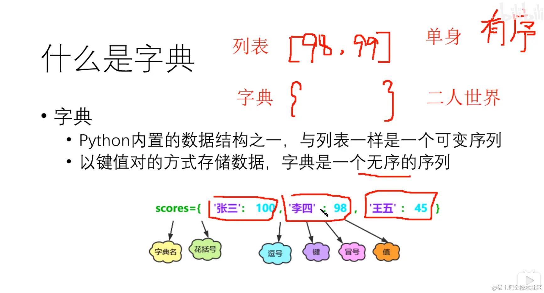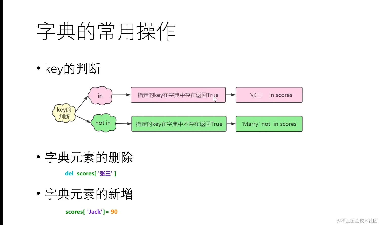 笔记(7) 霞满天_这名字真不错 2020-10-27 137 阅读1分钟 这里的key1,key2,key3指的是第几个放入当中的键,str就是不可变序列,不可变序列的特点是不可以执行增删改操作,字典的查找过程都是先通过hash(key)函数计算存储位置,找到value来实现的 冒号左边的是键,右边的是值,统称键值对内置函数内的左侧由于是 =赋值 的形式右侧的话,根据类型来判断,jack是str则加,20为int,则不需要加 两种方法的区别在于前者要获取字典中没有的元素会报错,后者不报错,报None 后面的scores[item]和scores.get(item)都是获取字典的值 李四把张三给覆盖掉了