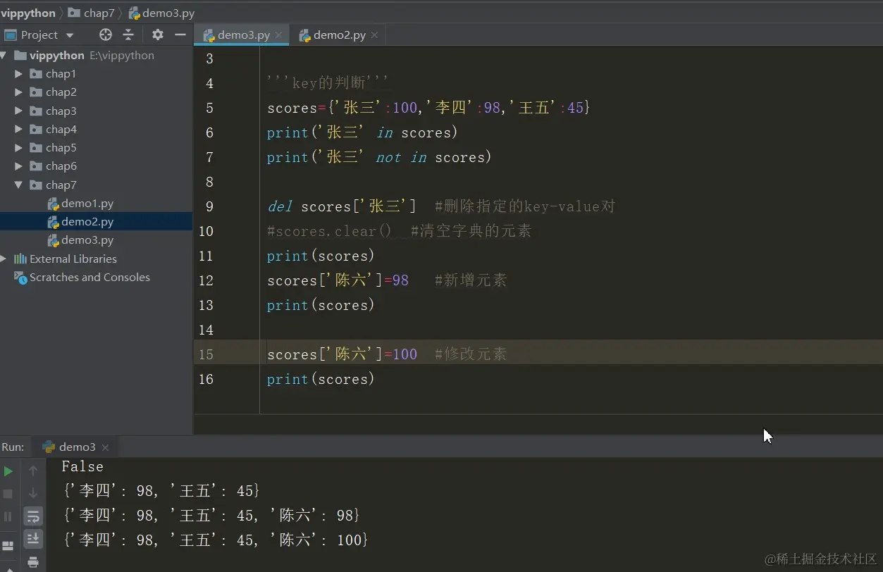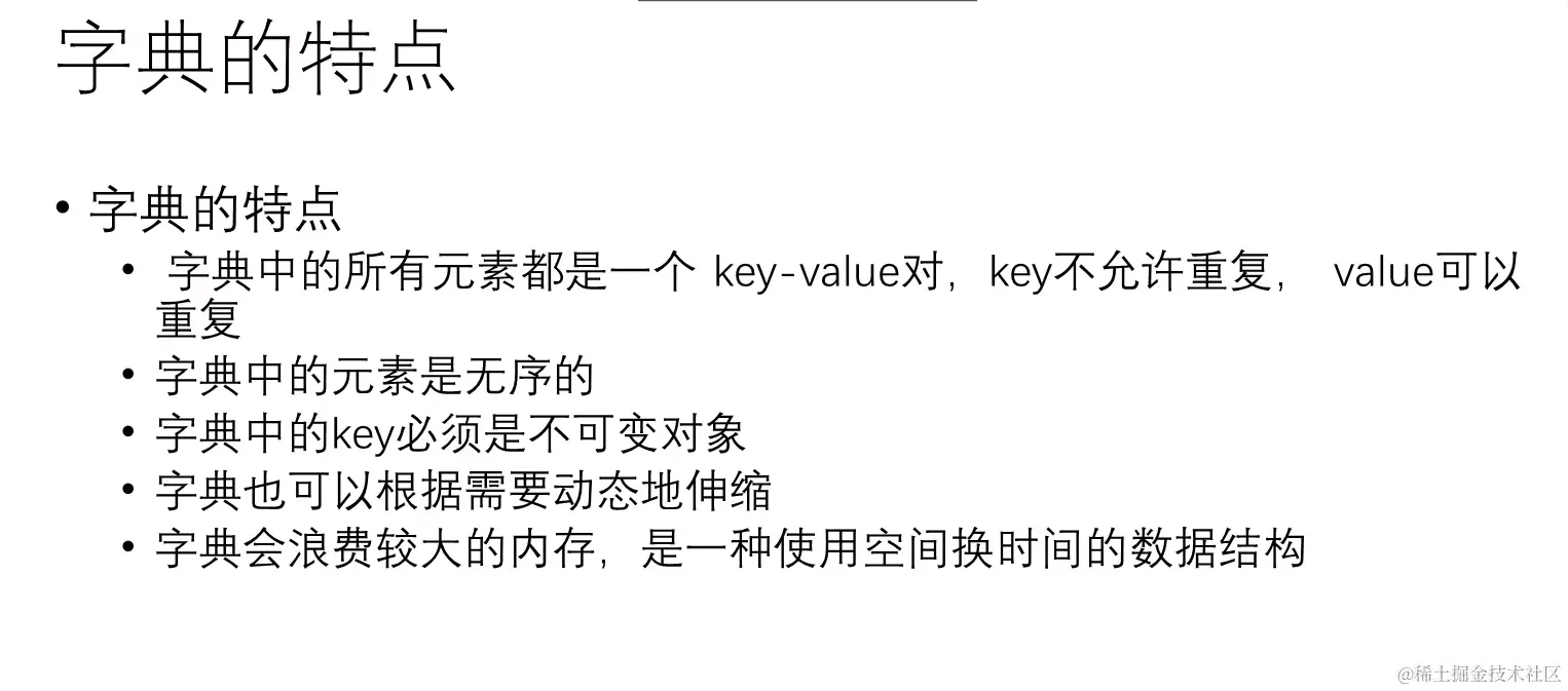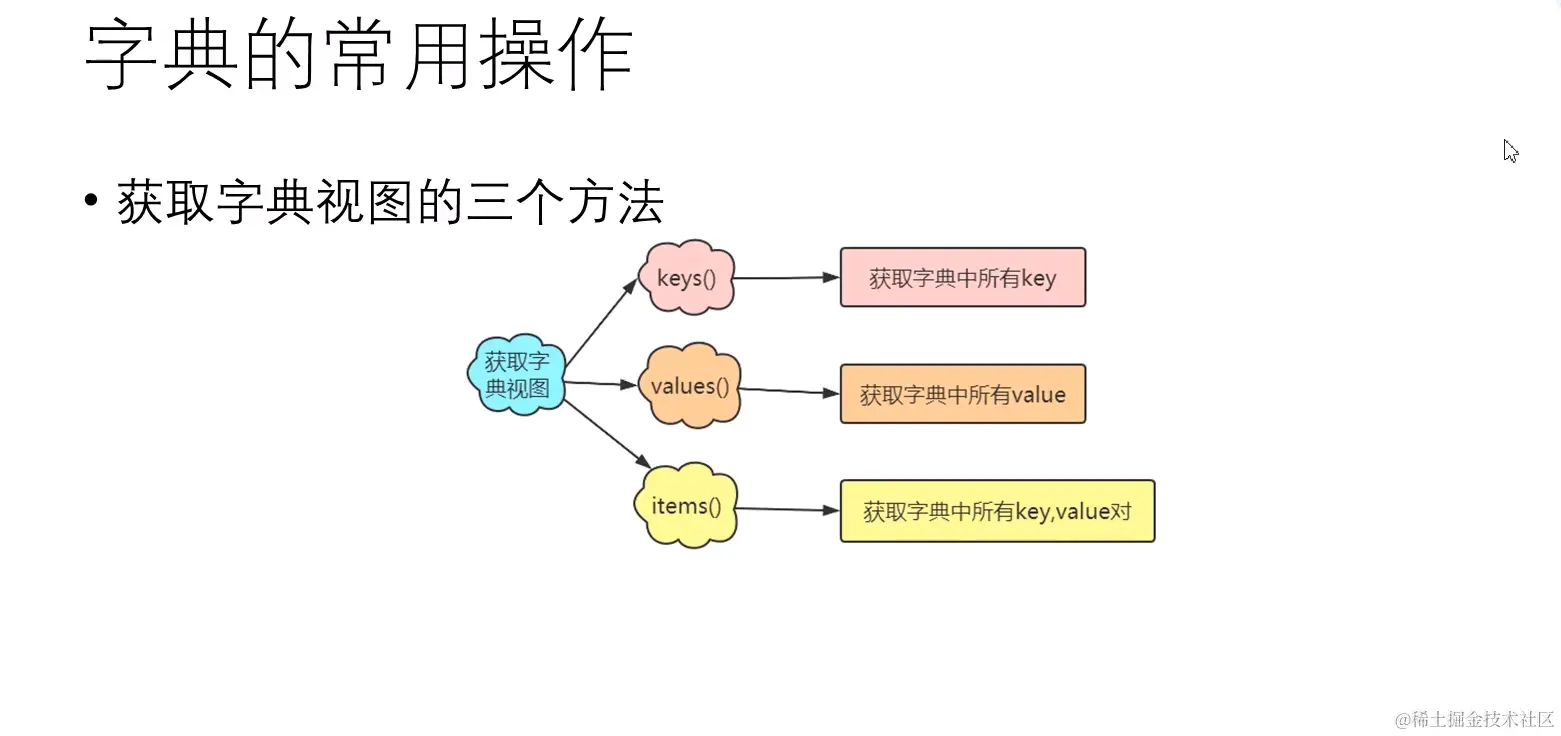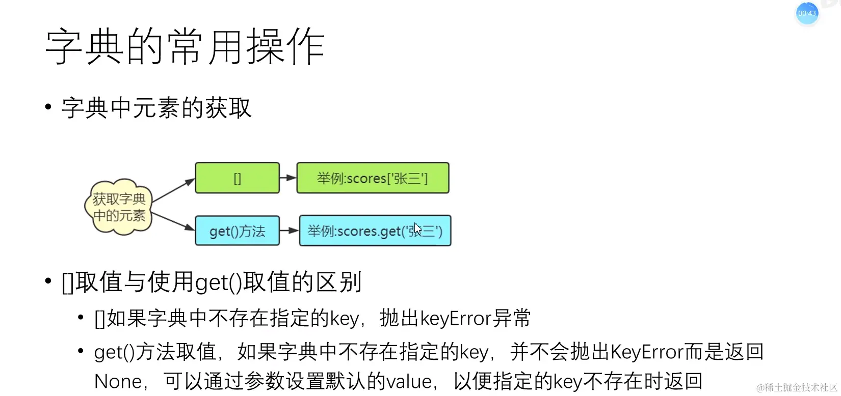 笔记(7) 霞满天_这名字真不错 2020-10-27 137 阅读1分钟 这里的key1,key2,key3指的是第几个放入当中的键,str就是不可变序列,不可变序列的特点是不可以执行增删改操作,字典的查找过程都是先通过hash(key)函数计算存储位置,找到value来实现的 冒号左边的是键,右边的是值,统称键值对内置函数内的左侧由于是 =赋值 的形式右侧的话,根据类型来判断,jack是str则加,20为int,则不需要加 两种方法的区别在于前者要获取字典中没有的元素会报错,后者不报错,报None 后面的scores[item]和scores.get(item)都是获取字典的值 李四把张三给覆盖掉了