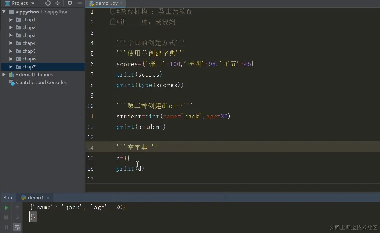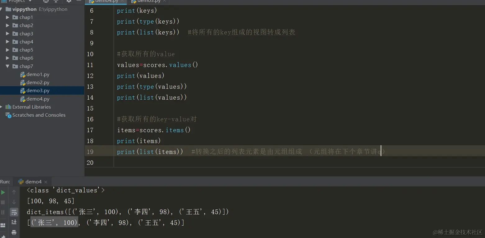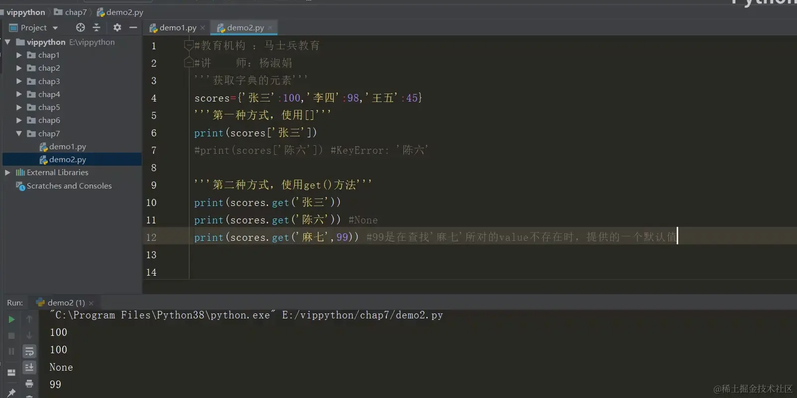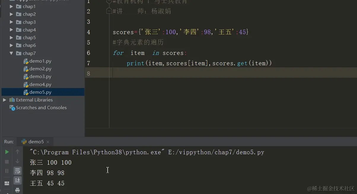 笔记(7) 霞满天_这名字真不错 2020-10-27 137 阅读1分钟 这里的key1,key2,key3指的是第几个放入当中的键,str就是不可变序列,不可变序列的特点是不可以执行增删改操作,字典的查找过程都是先通过hash(key)函数计算存储位置,找到value来实现的 冒号左边的是键,右边的是值,统称键值对内置函数内的左侧由于是 =赋值 的形式右侧的话,根据类型来判断,jack是str则加,20为int,则不需要加 两种方法的区别在于前者要获取字典中没有的元素会报错,后者不报错,报None 后面的scores[item]和scores.get(item)都是获取字典的值 李四把张三给覆盖掉了