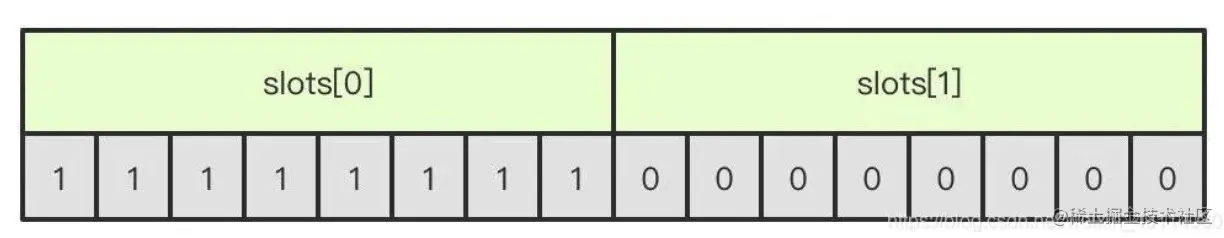 slot是一个位数组,数组的长度是16384/8=2048,而数组的每一位用1表示被节点处理,0表示不处理,如图所示的话表示A节点处理0-7的slot。