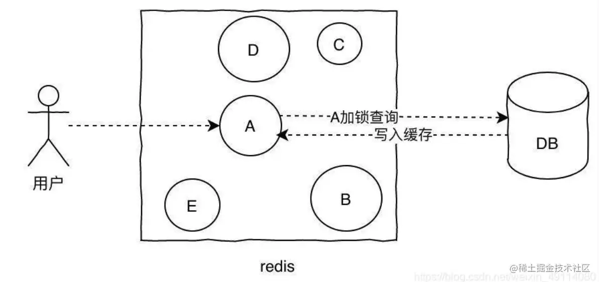 1、加锁更新,比如请求查询A,发现缓存中没有,对A这个key加锁,同时去数据库查询数据,写入缓存,再返回给用户,这样后面的请求就可以从缓存中拿到数据了。