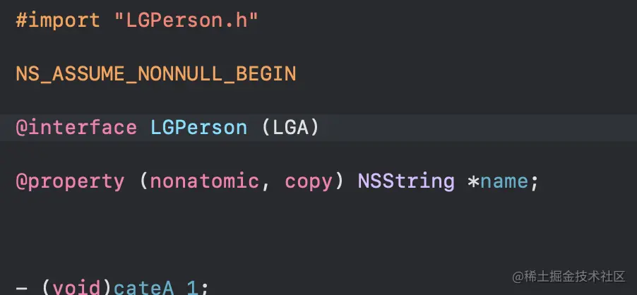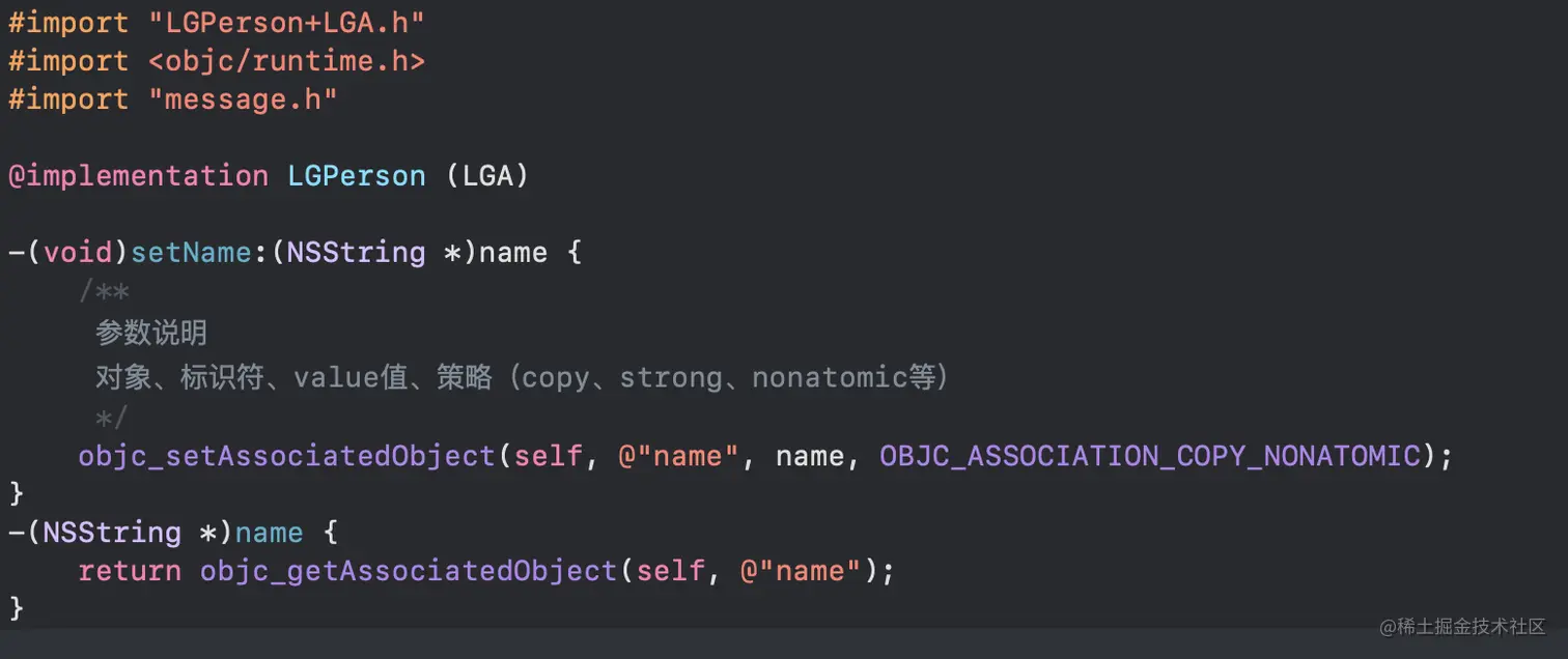 我们定义一个LGPerson的类,继承于NSObject,添加LGPerson的分类LGPerson+LGA,在LGPerson+LGA分类中添加属性name,实现其set跟get方法,代码如下