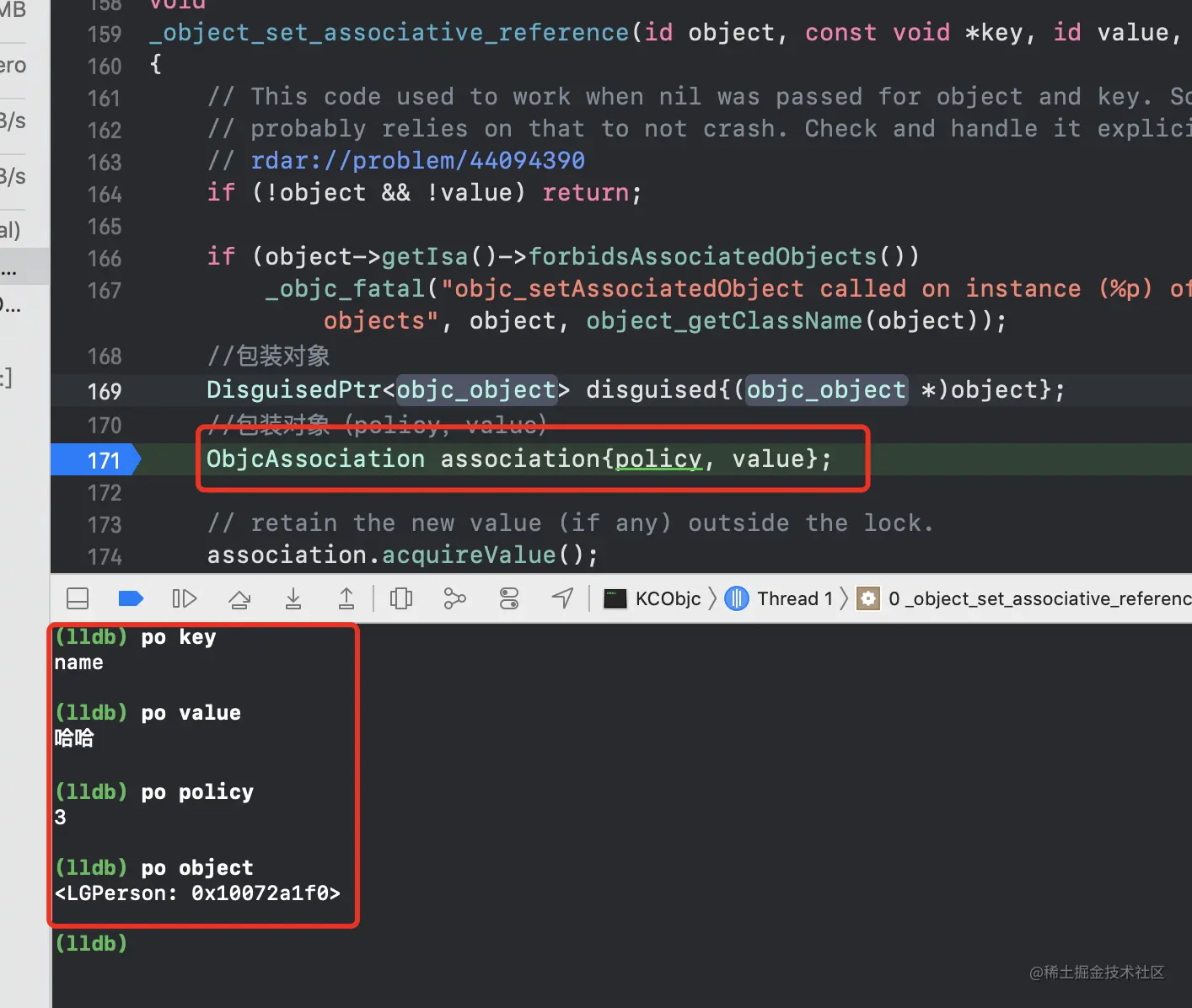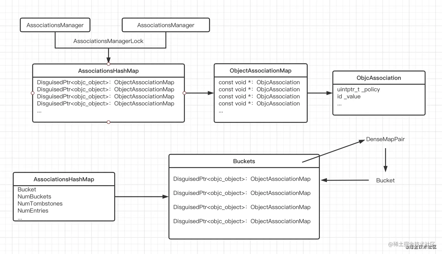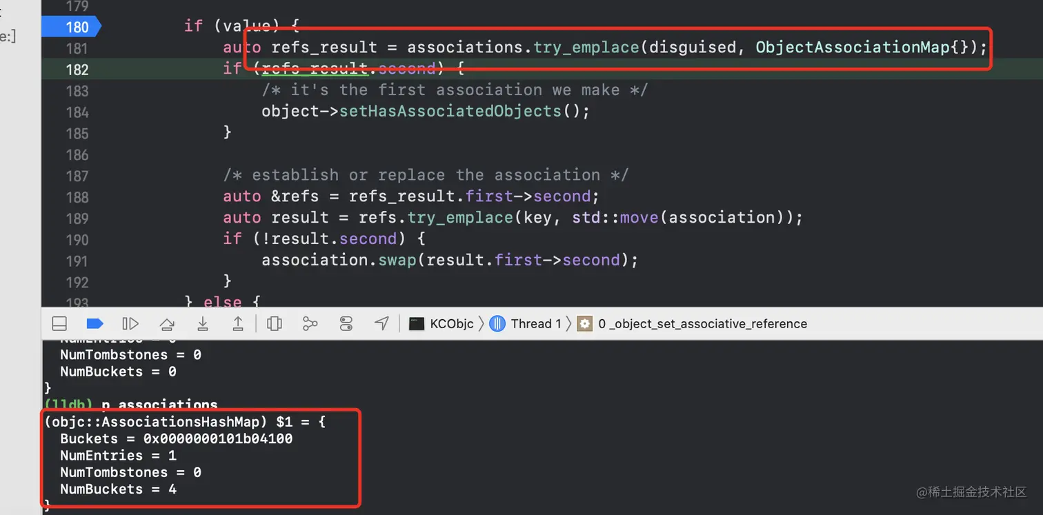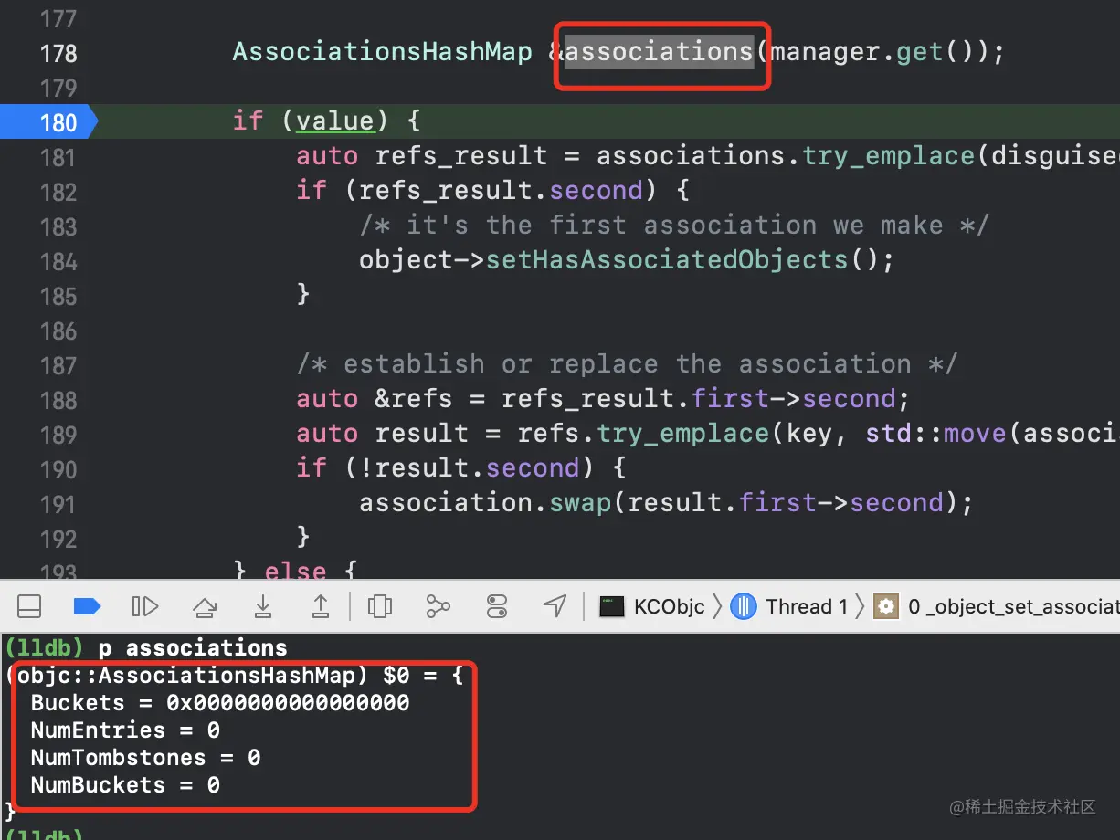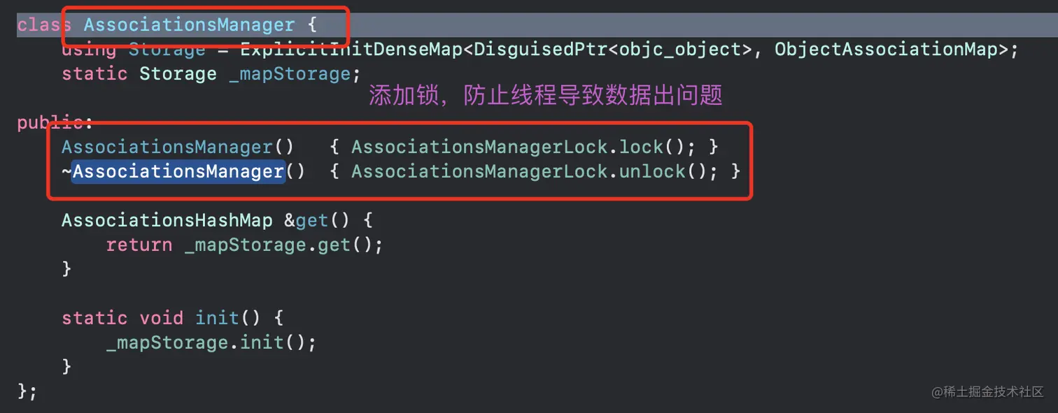 policy给属性添加的是copy还是retain AssociationsManager是个析构函数,可以声明多个不是唯一的AssociationsHashMap是全局唯一的哈希表,我们从上面可以看出AssociationsHashMap是通过_mapStorage.get()获得,而_mapStorage是通过static void init()初始化得到,由于使用了static,因此AssociationsHashMap是全局唯一- 查看哈希表是何时赋值的