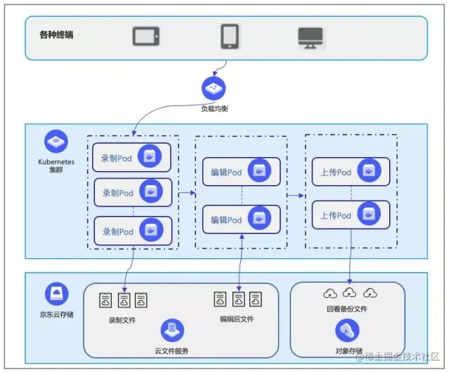 如上图所示,各类客户终端通过网络负载均衡路由到Kubernetes集群,根据课堂需要启动录制Pod,用以视频、音频的录制,增加课堂互动设置等,该类Pod会将录制的视频流直接写入云文件存储中。 在线教育高峰期间会有数千个课堂,即数千个录制Pod共享写文件存储;录制完成后,需要对录制内容进行简单的编辑处理,生成可回看的素材,该类任务录制完成的数量动态拉起编辑Pod,对文件存储进行读写编辑,最后生成回看文件;后期将回看文件上传到云对象存储中,供学生及家长回看课堂内容。 京东智联云解决方案带来的优势: