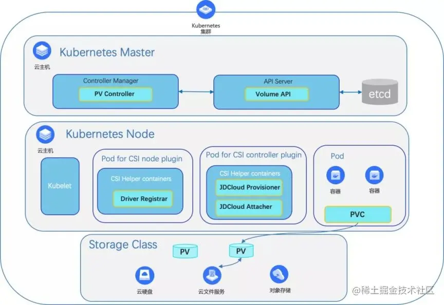 如下图所示,容器存储控制面是通过标准的京东智联云CSI,规范的API接口创建、删除、加载、卸载Volume: