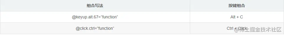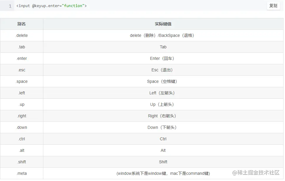 在Vue中,已经为常用的按键设置了别名,这样我们就无需再去匹配keyCode,直接使用别名就能监听按键的事件。