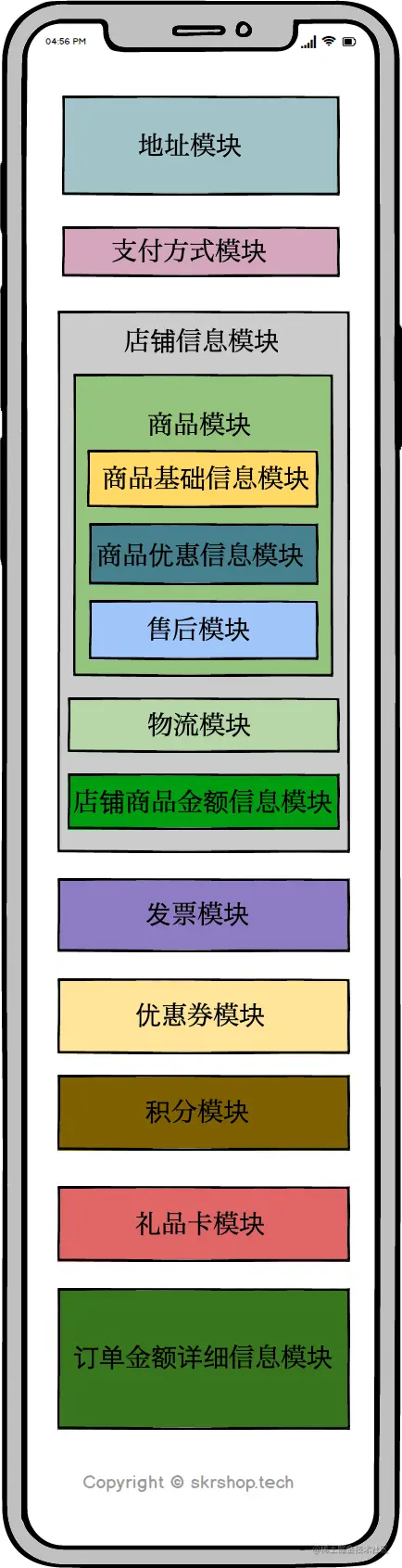 我们依据上面整理的内容,再通过以往的经验把订单结算页面进行模块化拆分和组合,得到如下订单结算页面的模块化构成: