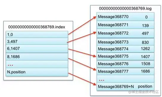 其中以索引文件中元数据8,1686为例,其中8代表在右边log数据文件中从上到下第8个消息(在全局partiton表示第368777个消息),其中1686表示该消息的物理偏移地址(位置)为1686。