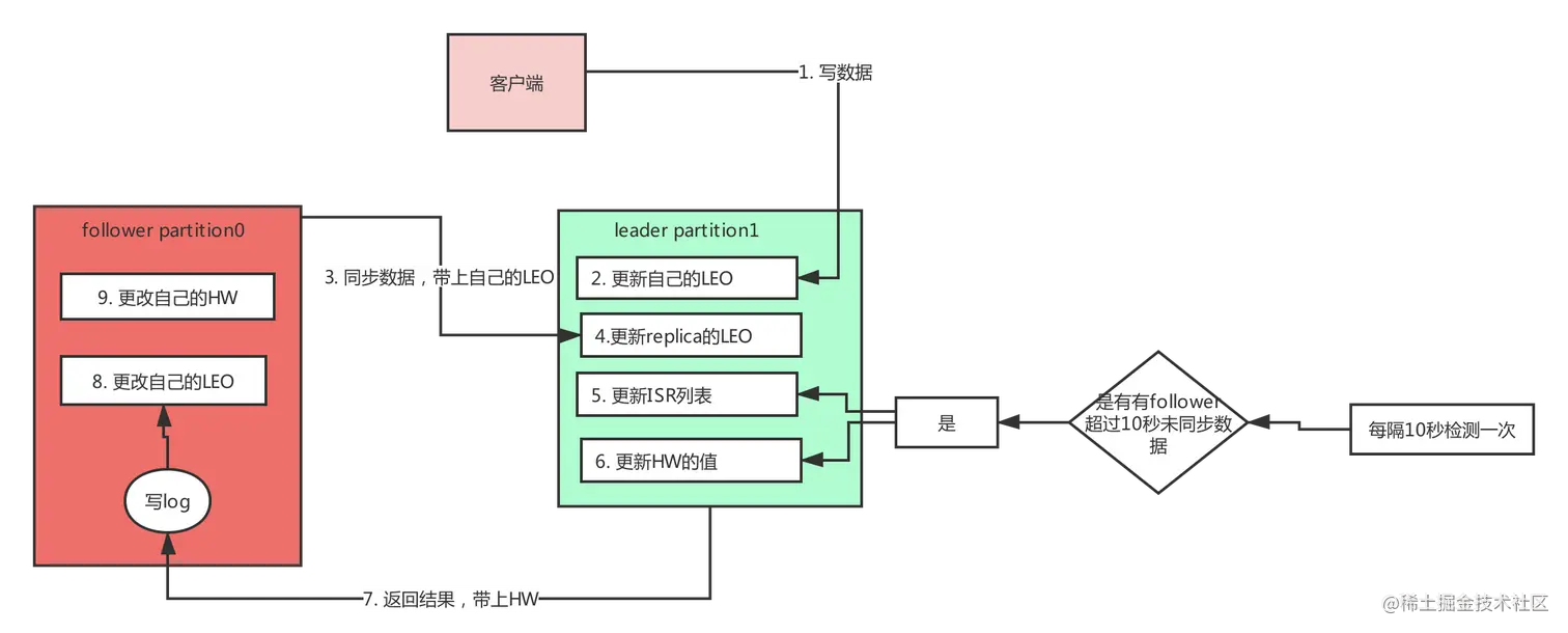 首先,Follower 发送 FETCH 请求给 Leader。接着,Leader 会读取底层日志文件中的消 息数据,再更新它内存中的 Follower 副本的 LEO 值,更新为 FETCH 请求中的 fetchOffset 值。最后,尝试更新分区高水位值。Follower 接收到 FETCH 响应之后,会把 消息写入到底层日志,接着更新 LEO 和 HW 值。