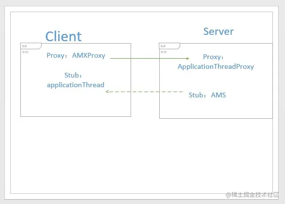 AMP(ActivityManagerProxy)作为服务启动代理,运行在客户端,负责将数据序列化传递给stub。在app中使用ams提供的功能,比如startActivity,是通过ams在客户端的代理AMP发起的