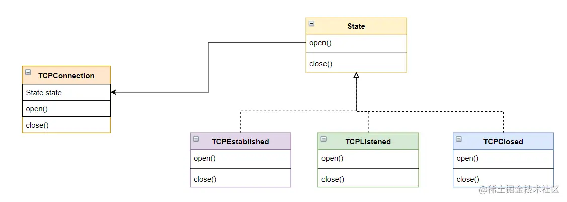 我们在日常学习中这种状况很常见,比如TCP连接建立和销毁的过程,从不同的状态进行迁移,而表现出来地动作也不相同,又如一个线程的的状态,从五个状态不断地切换。