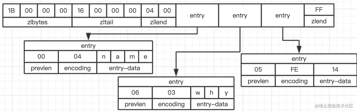 然后用4byte表示zltail,0x16=22,表示最后一项数据项在字节数组的第22位置