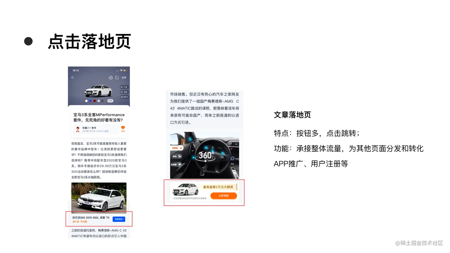 点击落地页,通常常见的是文章落地页,在传达内容的同时,通过插入广告等促使用户点击达到引流的作用