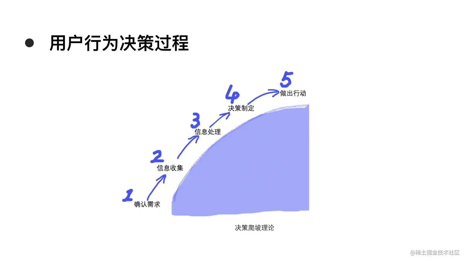 但是用户在决策行为的过程中,会有一个艰难的心里决策过程,在心里行为学上有一个决策爬坡理论:当用户意识到自身有一定的需求时,会相应地寻找如果达成需求的各种信息方法等,通过搜集到的信息,进行筛选处理,然后最终确认后做出行动。比如用户在想购买一辆汽车时,会考虑购买哪个品牌哪个型号的车,然后会通过不同途径(APP、线下4S店等)了解这辆车的所有信息,然后对比多家优惠信息,品质保障等信息之后确认购买,最终下定单完成这个心里决策过程。