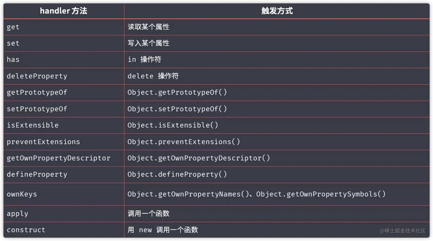 object.defineProperty和proxy对比 xiaoxiaoo 2020-10-28 224 阅读1分钟 1. defineProperty只能监听对象的读写 2. proxy能监听到更多对象操作,比如delete property,call method等 3. proxy能更好的支持数组对象的监听 对数组对象来说,使用defineProperty的话,就得重写数组对象的操作方法,也是vue.js采用的方式 4. proxy是以非侵入式的方式,监听了对象的读写,个人感觉,有点像装饰器模式,而defineProperty如果要对每个对象的每个属性做监听,就需要做很多额外的操作。