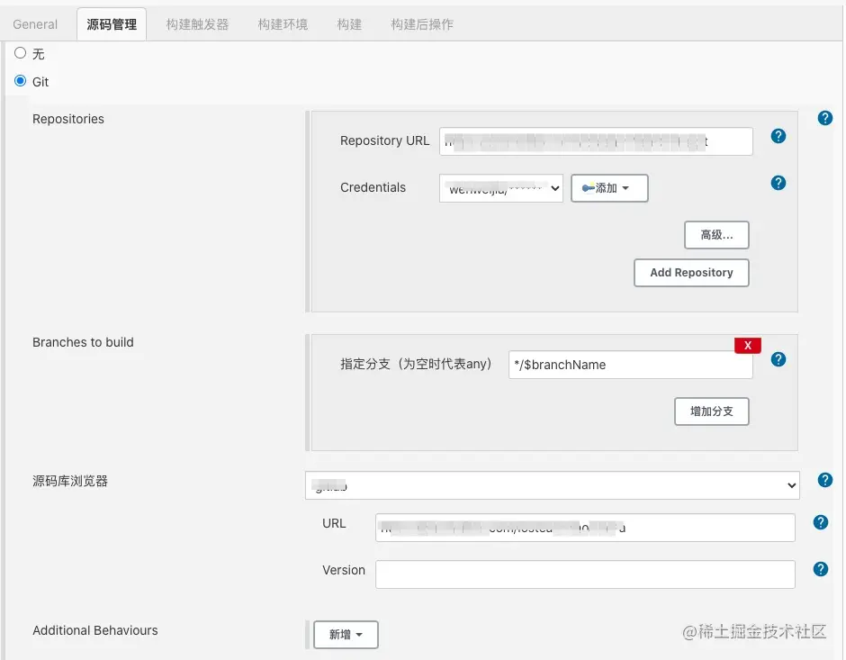 管码管理选择的是Git,填写自己项目的Git链接,填写凭证,例如用的是HTTP,就填写账号密码即可。用的是SSH,就填写私钥。这里的$brachName,是指定分支,是上面参数化配置过程创建的。源码库浏览器,例如我司就填gitlab和URL路径(根据个人情况而定)。