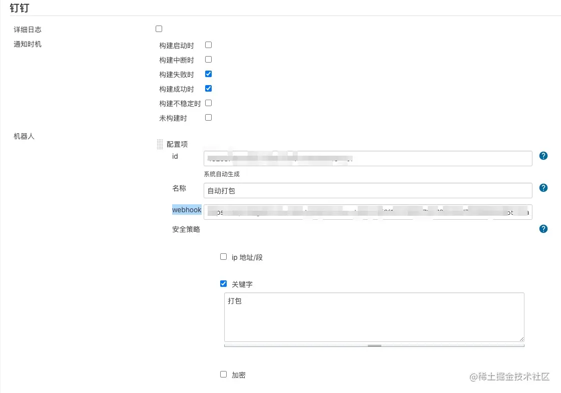 回到Jenkins,要用到钉钉推送消息,点击系统管理->系统配置,找到钉钉配置。通知时机选择构建失败时,和构建成功时(根据个人情况来定),机器人配置项,主要是webhook,名称,关键词和上述配置的一样即可。里面有个测试按钮,我们可以测试一下就知道能不能成功。