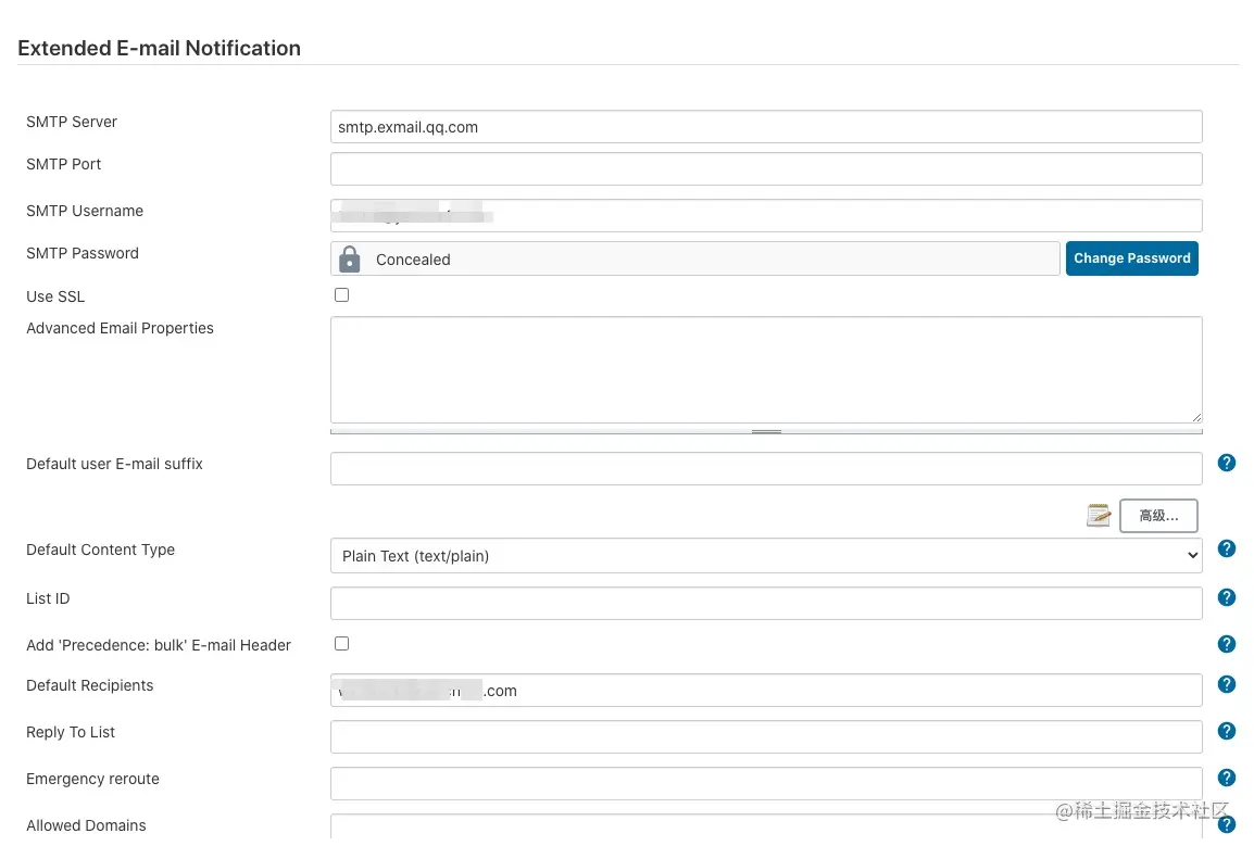 - 系统管理->系统配置,找到Extended E-mail Notification,填写自己的SMTP Server和端口,例如QQ就是smtp.exmail.qq.com,我们百度找下,或者在自己的邮箱,找到服务器设置里查看。选择高级,填写自己的邮箱地址和密码。