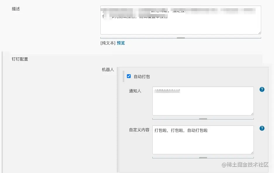 钉钉配置(安装插件才有),点击高级,填写通知人手机号码,多个通知人需要换行,填写自定义内容。