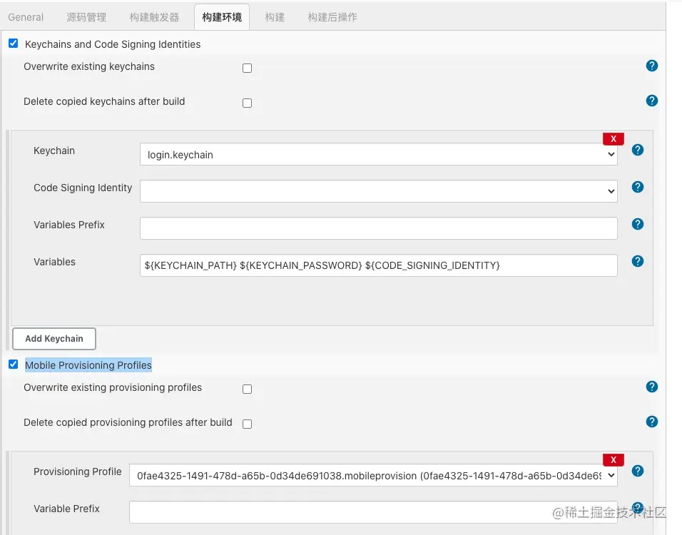 构建环境我们选择Keychains and Code Signing Identities和Mobile Provisioning Profiles,把我们之前配置的内容选上即可。