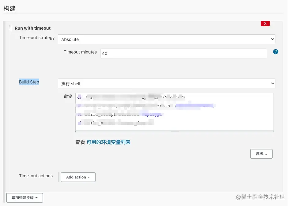 这里我们可以选择执行shell,也可以选择run with timeout,后者多了一个设置构建超时时间,Build Step选择的就是项目里面的脚本,就是配合fastlane使用。