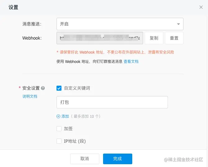 这个我们先来到钉钉,在群组里添加钉钉机器人,机器人进行设置,填写机器人名称,可以看到有webhook,安全设置有3项,我们任选一项就可以了。这里我选择了关键字(根据个人情况而定)。
