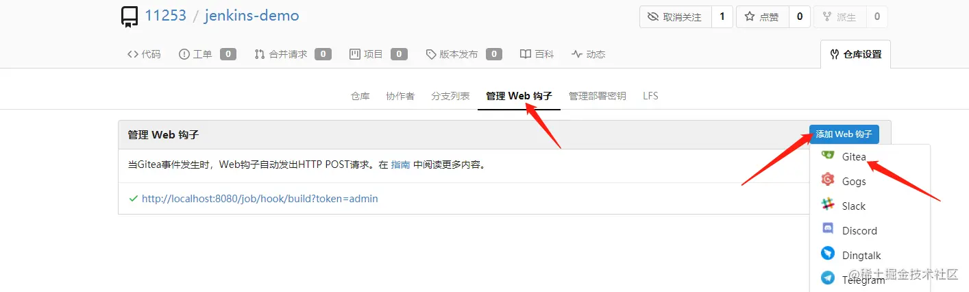 8、在管理web钩子中点击添加钩子按钮,然后在下拉选项中点击Gitea.