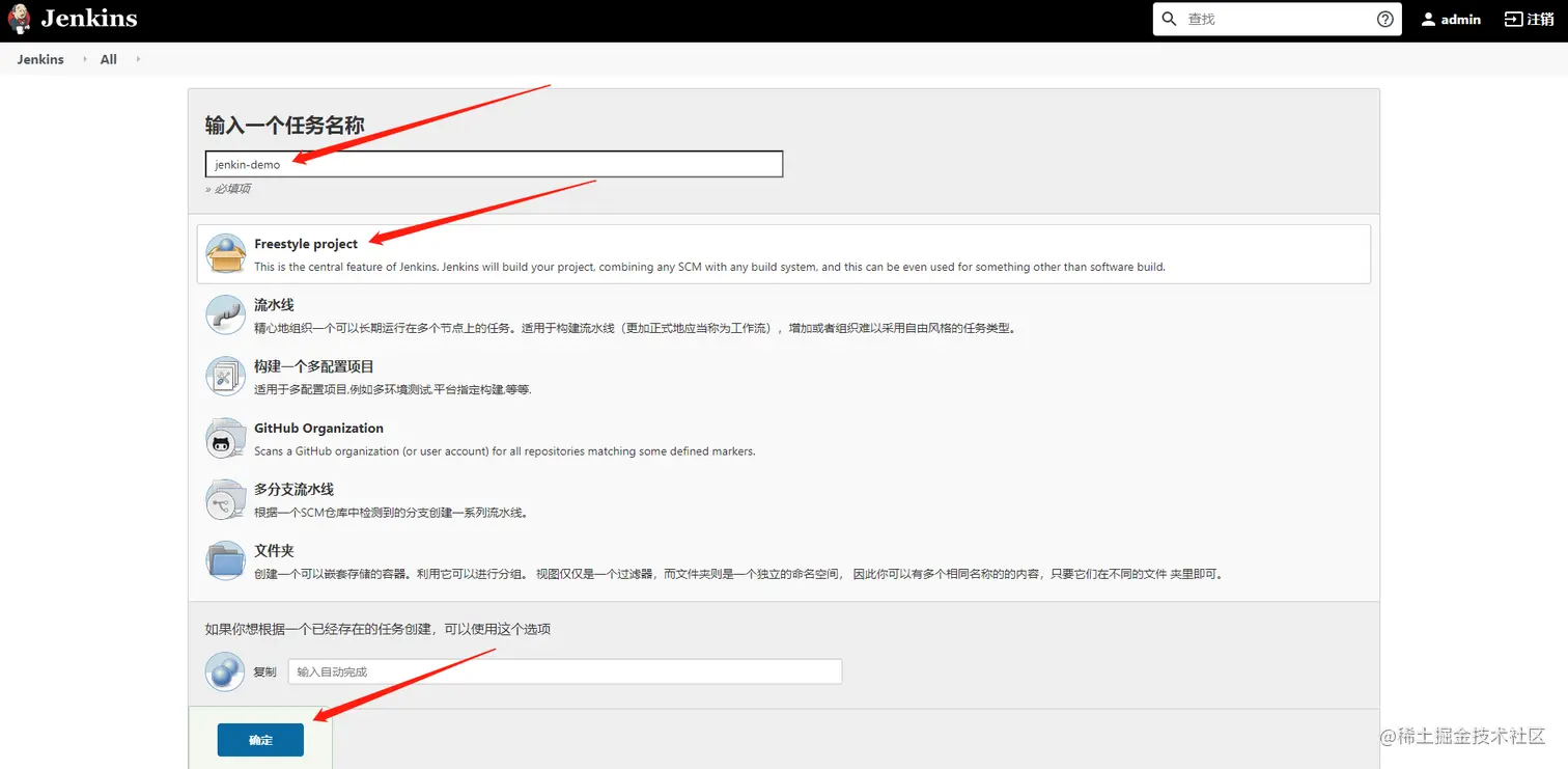 4、给 items 取一个名称,选择 FreesStyle project ,然后点击底部的确定按钮。