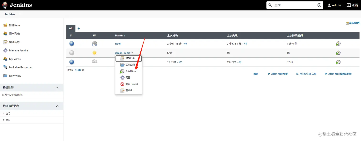 10、返回到首页就可以看到我们刚刚创建的Items了,点击名字后的三角形,然后在下拉框中选中Build Now,这个时候会进行第一次构建了。